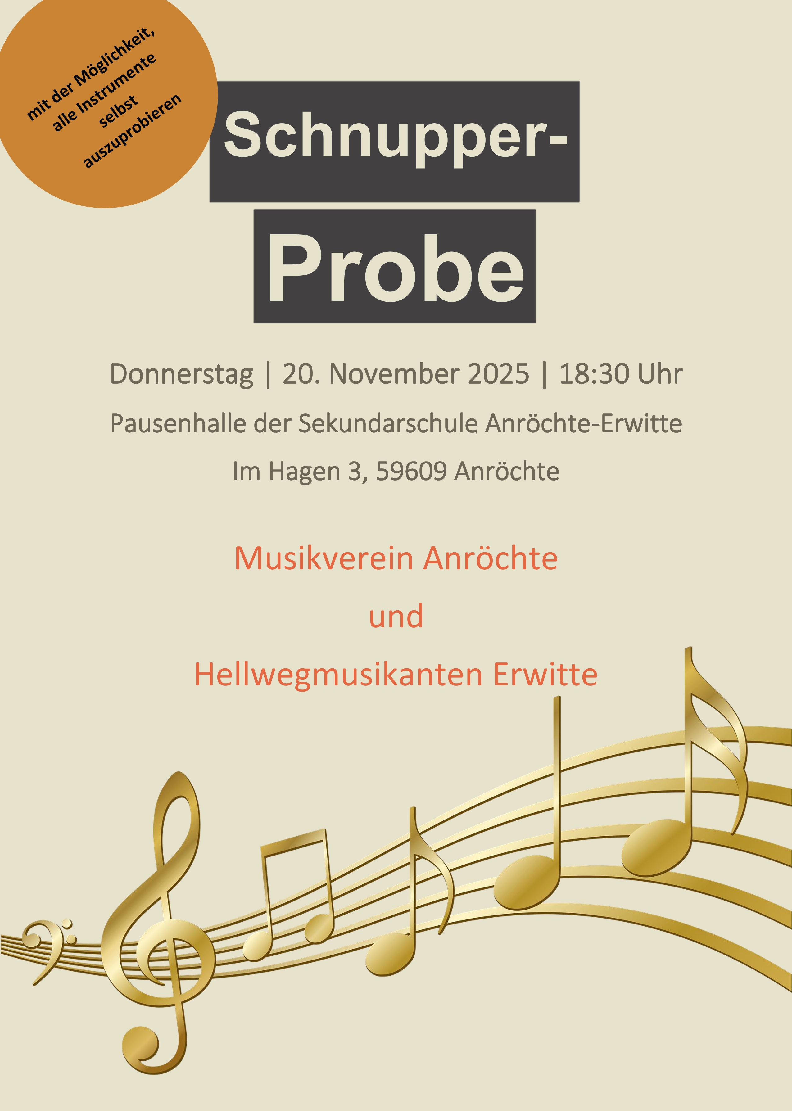 Der Musikverein Anröchte und die Hellwegmusikanten Erwitte laden ein zur Schnupperprobe, mit der Möglichkeit alle Instrumente selbst auszuprobieren.