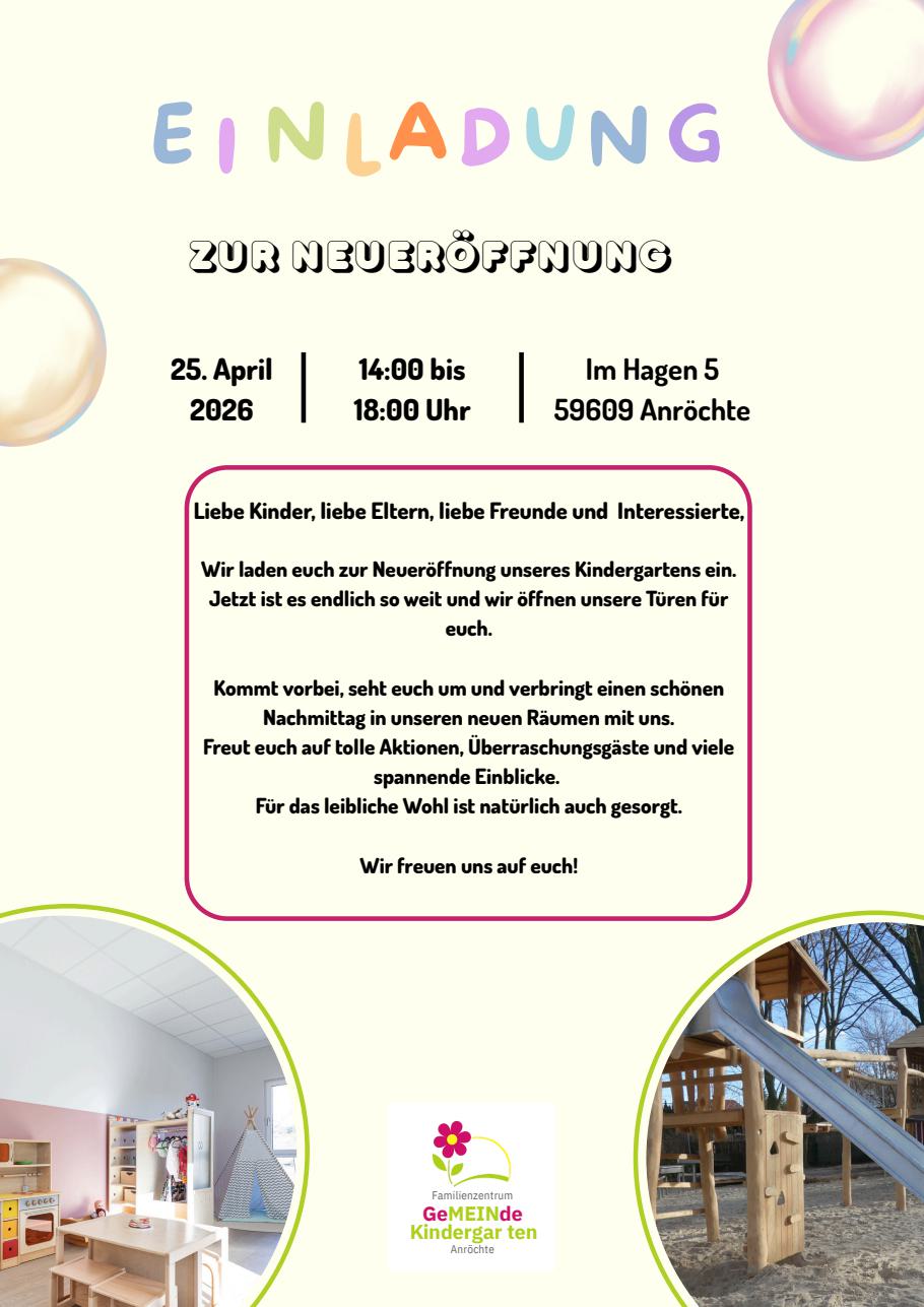 Der Gemeindekindergarten Anröchte lädt zur Neueröffnung des Kindergartens ein.