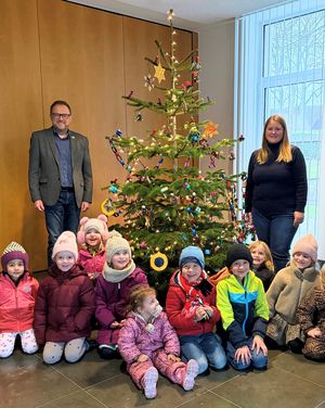 Kinder des Marienkindergartens Anröchte schmücken Weihnachtsbaum im Rathausfoyer