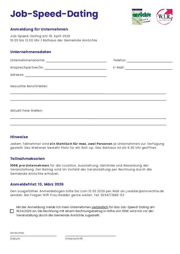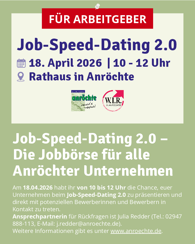 Herzlich eingeladen sind alle Interessierten und Bewerber, die sich beruflich verändern möchten oder einfach mal vorbeikommen möchten. Die Anröchter Arbeitgeber freuen sich auf Sie!