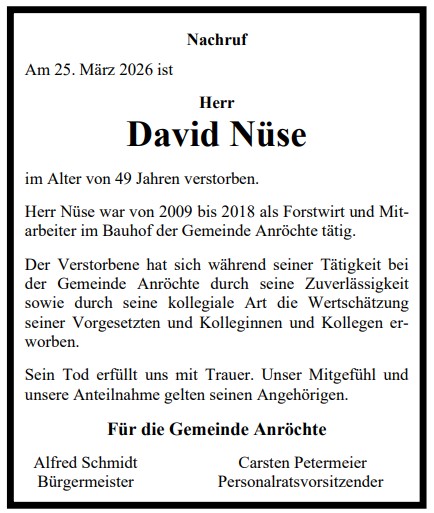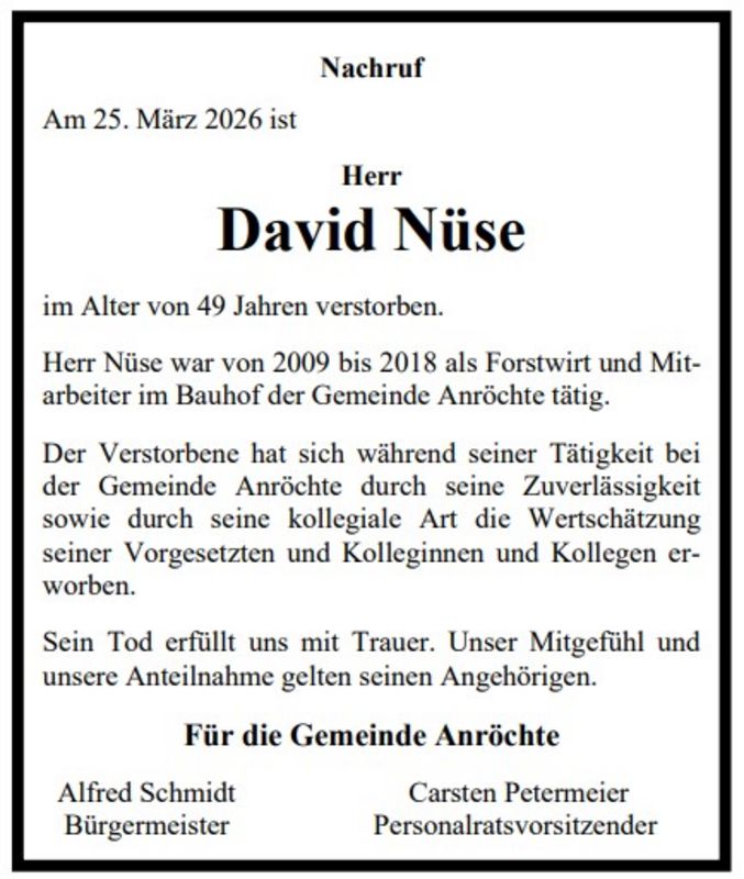Die Gemeinde Anröchte trauert um den ehemaligen Forstwirt und Mitarbeiter des Bauhofes der Gemeinde Anröchte, Herrn David Nüse, der am 25. März d. J. im Alter von 49 Jahren verstorben ist.